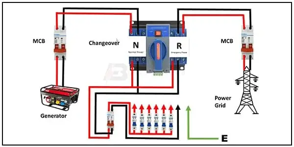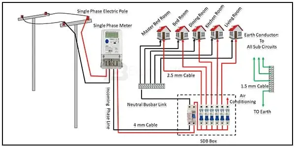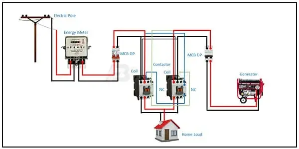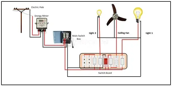 This diagram shows how to connect house wiring with the inverter. In this circuit diagram, we want to explain to you how to connect an inverter with a house load and power source connection. In this diagram we use 2 lights, 2 fans, 1 single-phase energy meter, Inverter, a 12V battery, some switches, sockets, and regulator, a DP MCB, etc. For more details please check our youtube video in below.